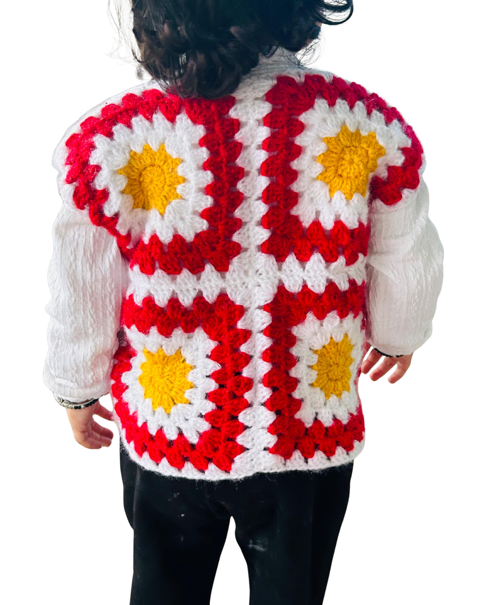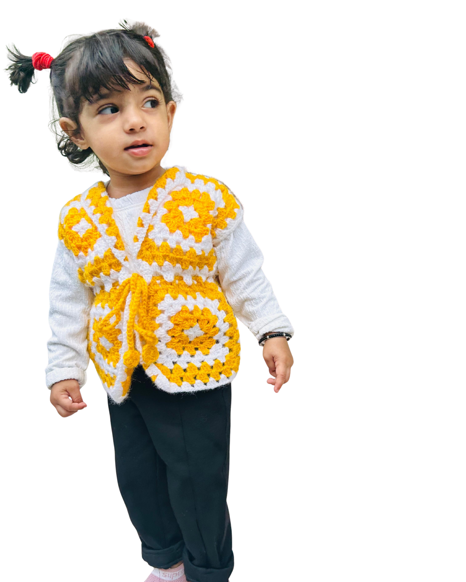 soft, premium yarn. Designed especially for little girls, this top is lightweight, breathable, and gentle on delicate skin. The classic granny square pattern adds a playful, handmade charm that never goes out of style.Available in three vibrant colour combinations and two size options to suit different age groups, making it perfect for both everyday wear and special occasions.