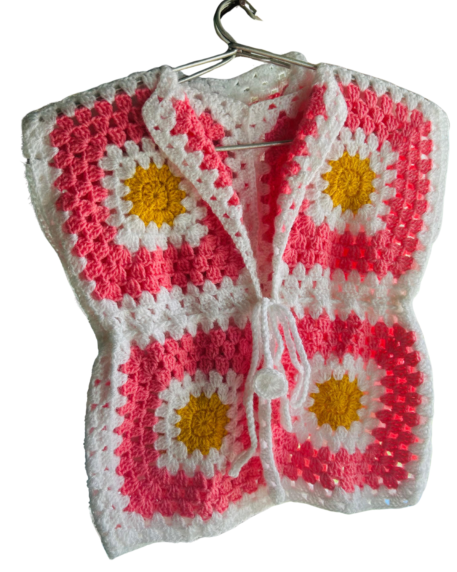 Handcrafted colourful granny square top for little girls, made with soft and comfortable yarn. Lightweight, breathable, and perfect for everyday wear. Available in three colours and multiple age sizes.