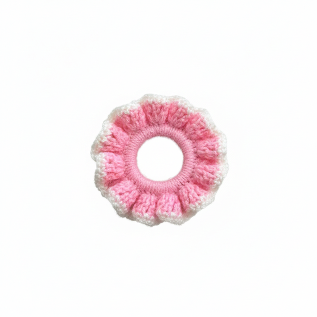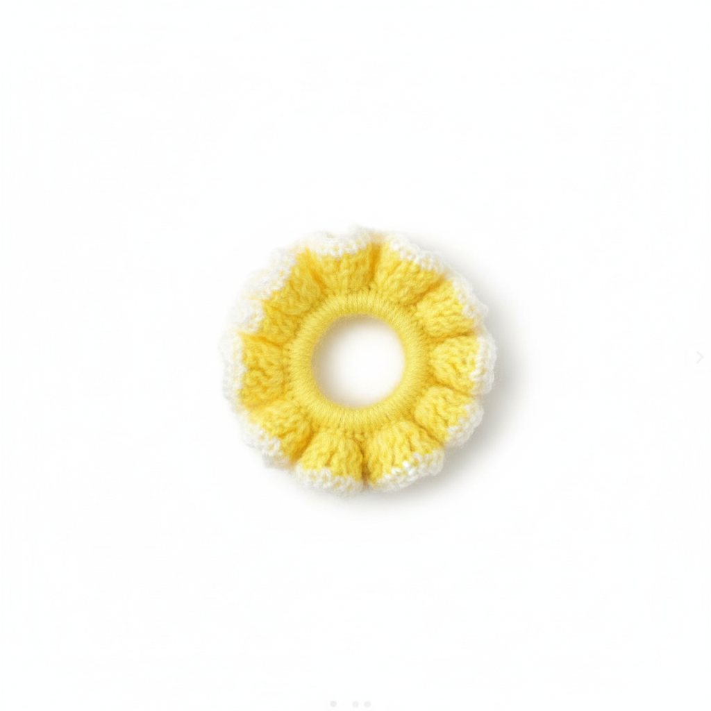 Hand-crocheted yarn scrunchies with ruffled petal edges on sturdy elastic; soft, stretchable, and gentle on hair.