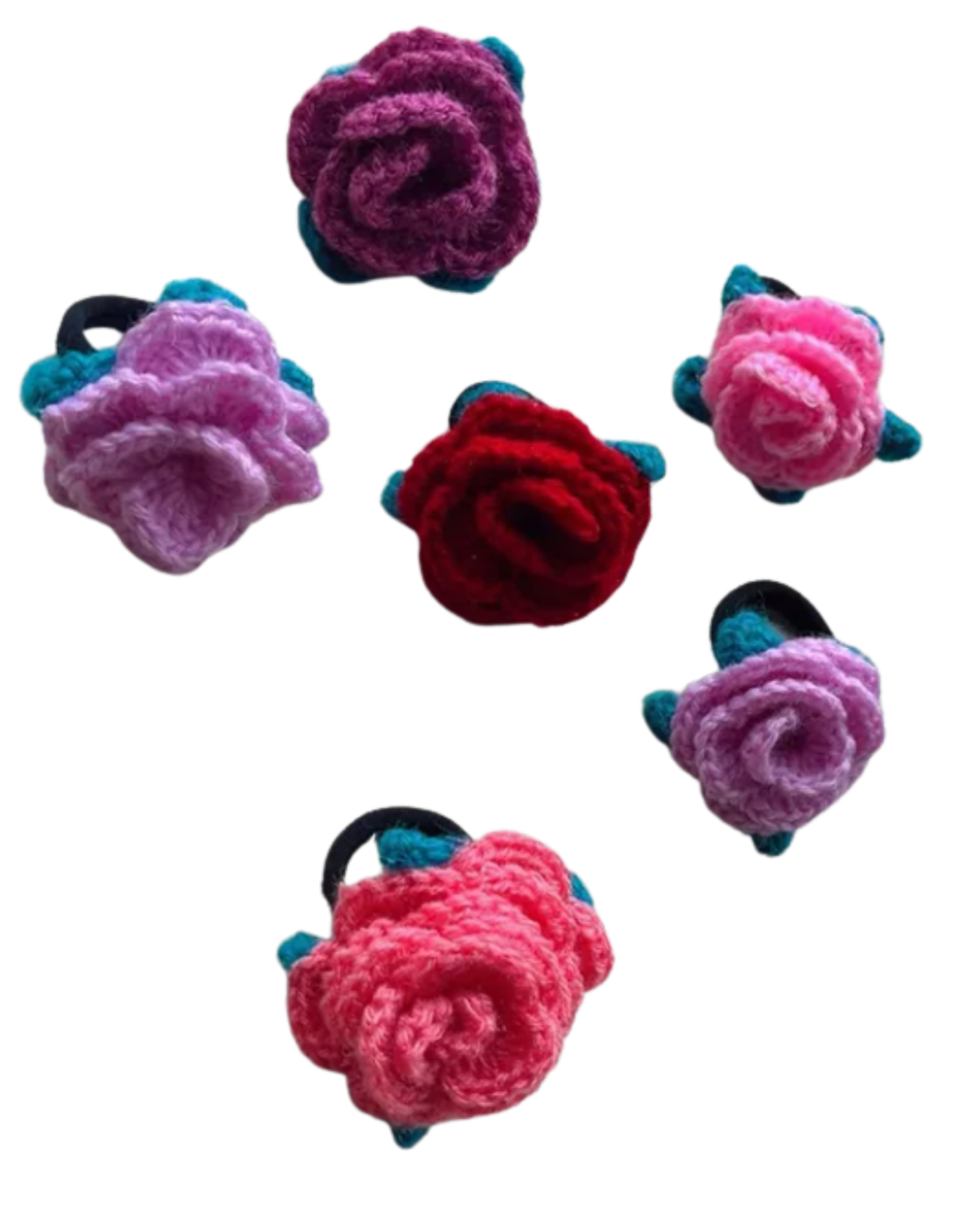 A cute set of 6 handmade crochet flower rubber bands, made with soft yarn and stretchable elastic. Gentle on hair, lightweight, and perfect for daily use or gifting.